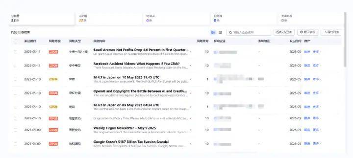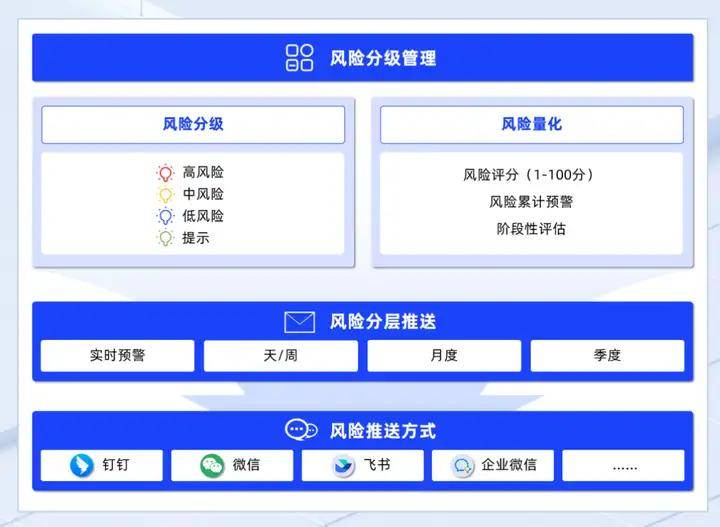 通过对风险的分级、量化取分层,对接内部系统及时预警推送。除天然灾祸、合规风险等供应链风险外,启信慧眼还支撑对供应商的根基消息、司法诉讼、失信被施行、旧事动态等数百项细分风险事务开展及时,为处理大量风险消息堆积的问题,企业能够按照本身风险偏好将风险事务设置为“高风险、中风险、低风险、提醒”不划一级,或对风险事务进行量化评分,正在此根本长进行风险分层,例如高风险事务及时预警、中风险按天/周推送,可选择将风险推送至钉钉、飞书、企微、微信等系统,及时把握应对的窗口期。